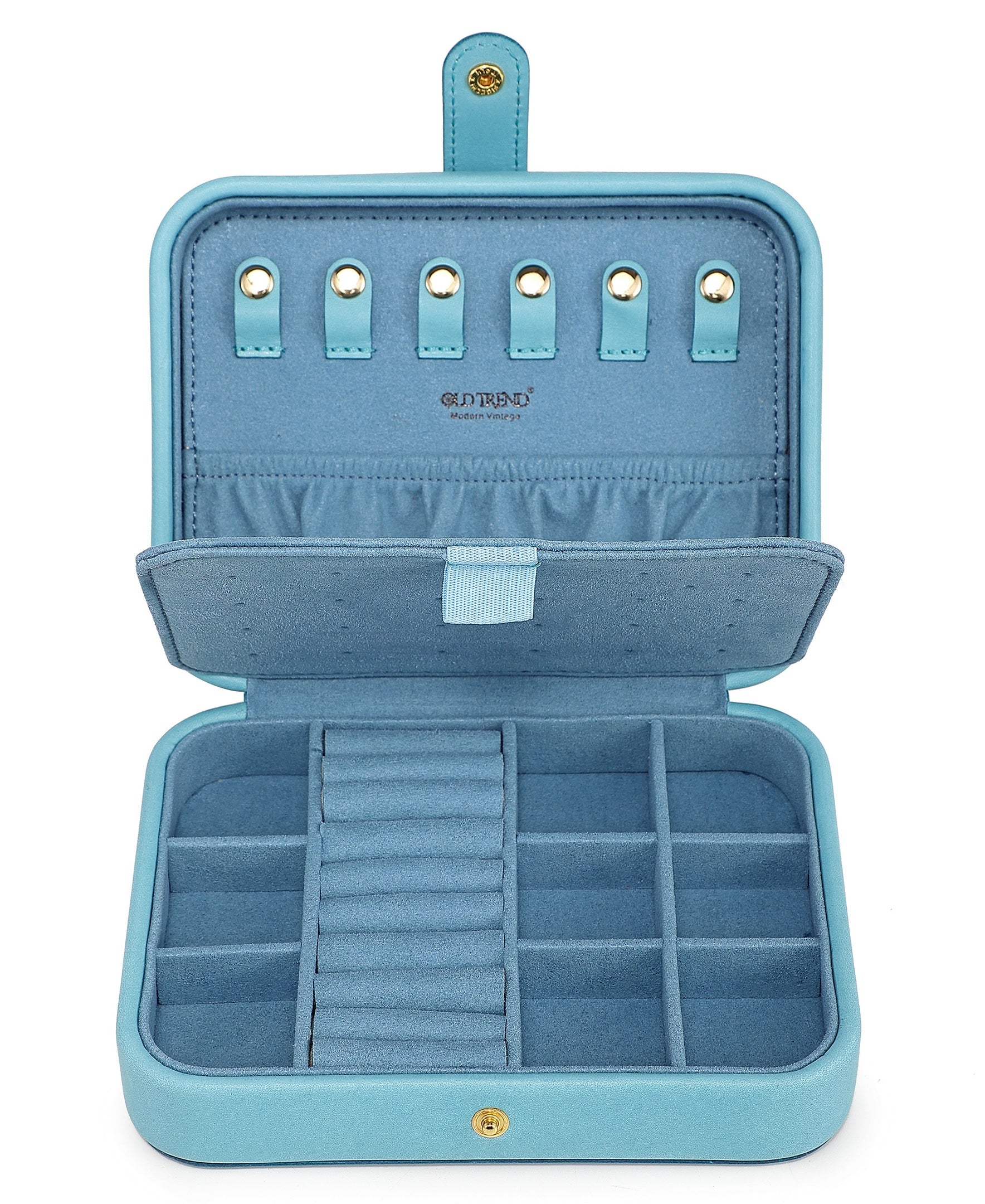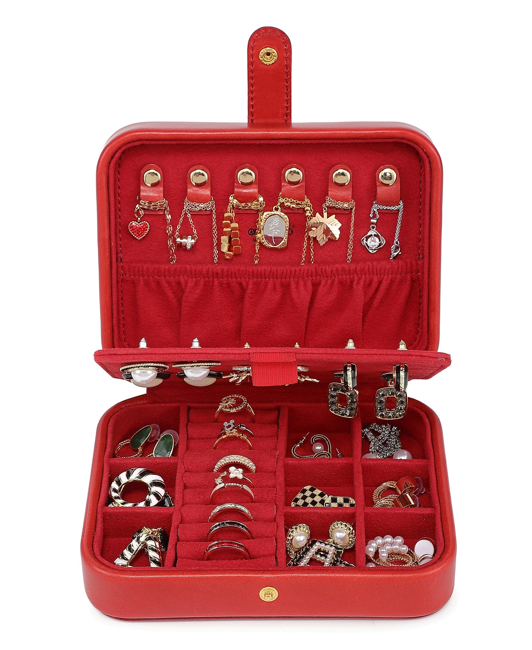- Interior: (22) Earring Holder, (9) Ring Rolls, (6) Necklace Button Hook, (1) Elastic Pocket, (9) Loose Jewelry Compartments